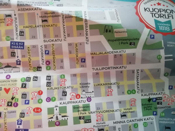 Lasten kanssa pitää käydä Lelukauppa Partasessa, mutta lapsen housut kannattaa pakata jo kotoa mukaan, koska sen verran vaikealta tuntui illalla löytää Kuopion keskustasta pienelle ihmiselle verkkarit. Pienten kanssa kaupunkia on kiva kiertää katujunasta käsin tai matkan satamaan voi taittaa pyöräriksalla.
